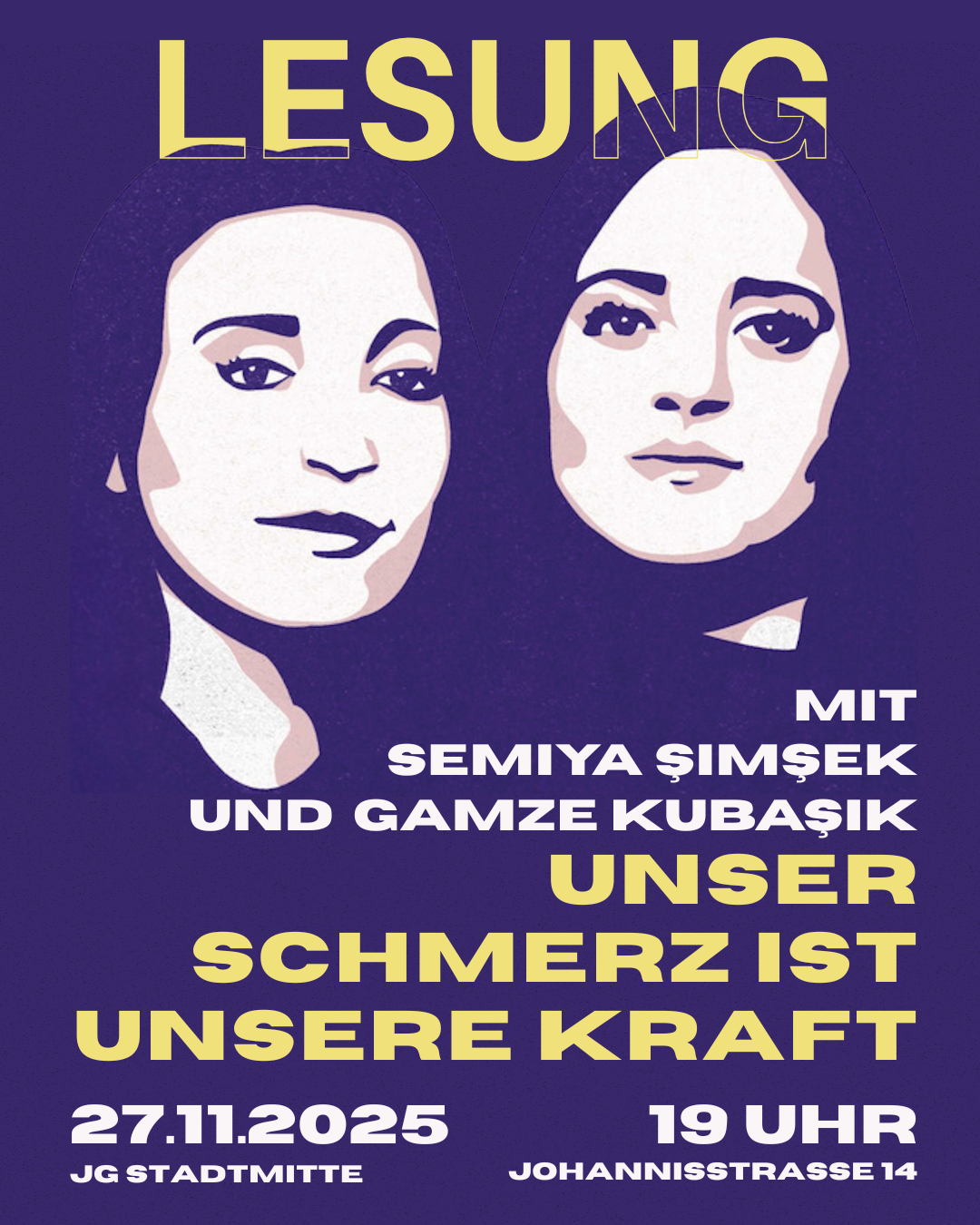 Am 27.11. sind Semiya Şimşek und Gamze Kubaşık bei uns in der JG zu Gast und lesen aus ihrem Buch. Im Anschluss gibt es die Möglichkeit zum Gespräch und Austausch